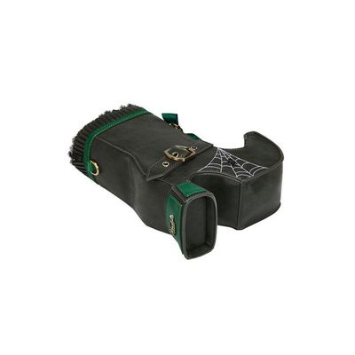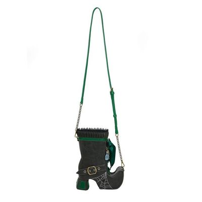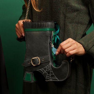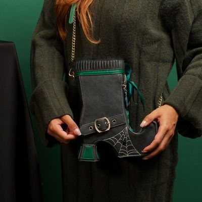 Abracadabra—behold the Witches Pantry Witches Boot Bag! This novelty bag is perfect for day or night, with a double zip closure and a choice of adjustable strap or last year's Witches Pantry wide shoulder strap. Shaped like a spell-casting boot, it’s crafted from black vegan leather and adorned with bow accents, spider rivets, embroidered cobwebs, and green laces. Add a spooky edge to your seasonal wardrobe with this “boot-iful” statement piece. You’re now suited, booted, and ready to dance till midnight!