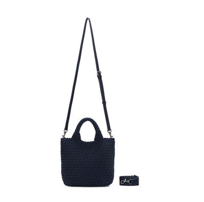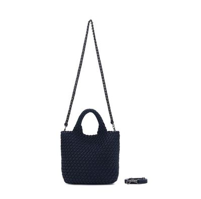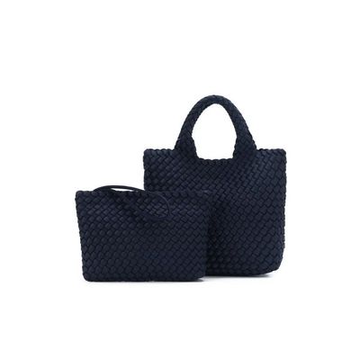 The Riviera Tote, crafted in handwoven neoprene, is a 2-piece set designed for style and versatility. Each bag includes a matching mini pouch and three interchangeable straps — a sleek vegan leather crossbody, a casual cotton strap, and a woven chain strap. Spacious yet chic, it transitions seamlessly from everyday errands to elevated outings.